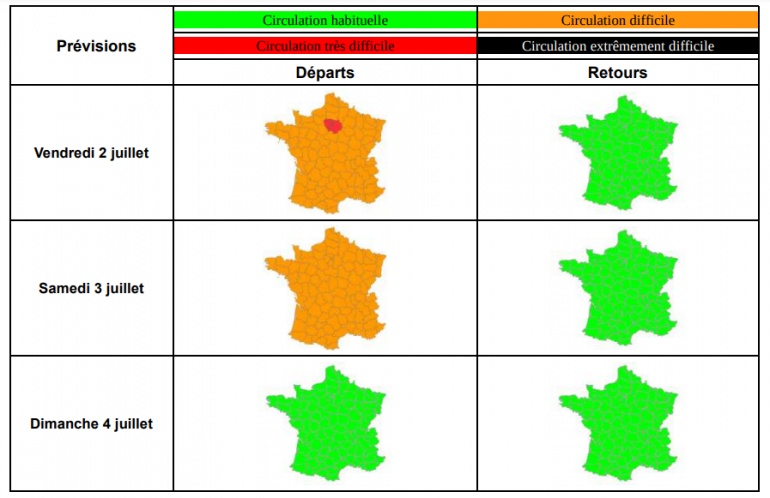 Le samedi 3 juillet, Bison futé place tous les départements en orange. Les routes françaises seront globalement très fréquentées, notamment par les touristes provenant de Belgique qui sont en vacances dès ce week-end. Le site de prévision du trafic routier recommande ainsi de quitter ou traverser les grandes agglomérations avant 8h. Il est également recommandé d'éviter l'autoroute A7 entre Lyon et Orange ainsi que l'A43 entre Lyon et Chambéry en milieu de journée.