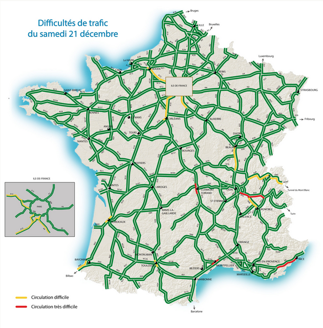 Samedi 21 décembre, l'ensemble de la France est en orange dans le sens des départs et en vert dans le sens des retours. Bison Futé recommande de ne pas quitter ou traverser l'Île-de-France entre 10h et 19h et les grandes métropoles entre 10h et 18h.