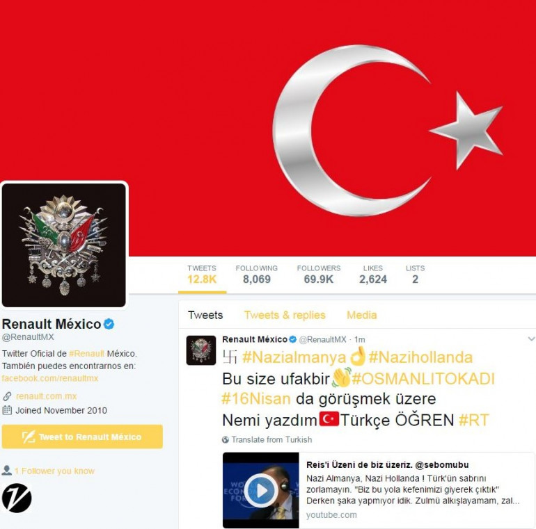 À chaque fois, le même message rédigé en turc est inscrit reprenant les hashtags "#Nazialmanya" (Allemagne nazie) et "#Nazihollanda" (Pays-Bas nazis). Et une vidéo accompagne le message sur laquelle on peut voir le président turc Recep Tayyip Erdogan. Sur certains comptes même, les logos et images de couverture ont été remplacés notamment par un drapeau turc. Difficile pour l'instant d'évaluer le nombre précis de comptes touchés. Les ministères français de l'Économie et des Finances, ainsi que le magazine Forbes et l'académie de Rennes avaient également été affectés tôt dans la matinée, avant que la situation ne revienne à la normale quelques dizaines de minutes plus tard.