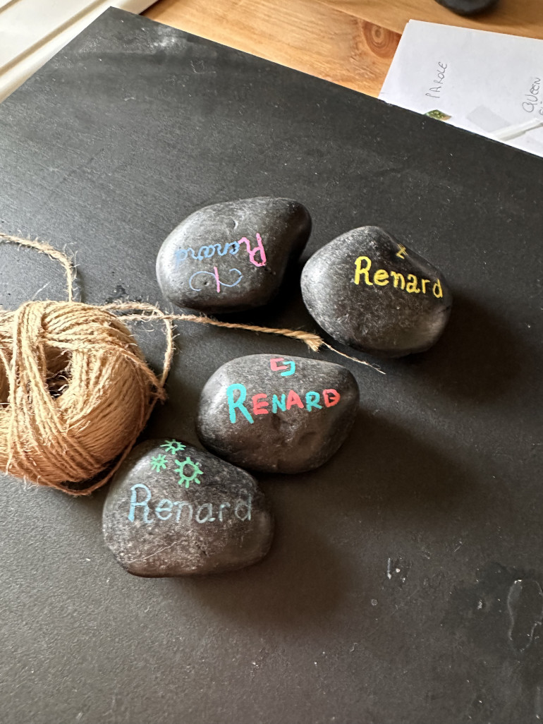 Les galets floqués du mot renard en l'honneur du chapardeur.