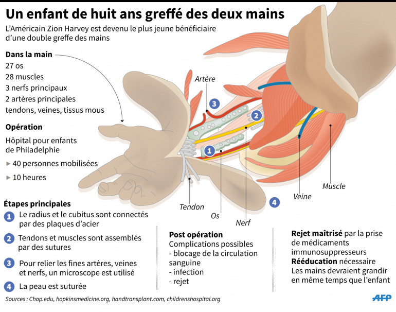 Description de la double greffe des mains subie par un Américain de huit ans.