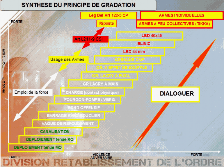 Cet usage proportionné s'échelonne selon les différentes situations. Le maintien de l'ordre est donc complexe, le but étant de ne pas causer de blessés graves ou de décès parmi la foule mais aussi que les forces de l'ordre puissent se protéger elles-mêmes en cas de violence des manifestants. Selon le code de la sécurité intérieure, l'emploi de la force doit être obligatoirement précédé de sommations ("Obéissance à la loi, dispersez-vous"), excepté si des "violences ou voies de fait" sont exercées contre les forces de l'ordre.