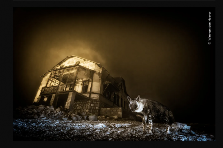 Comme le relate le site de musée londonien, l'animal "regarde fixement en direction de l'objectif, tandis qu'une imposante maison à moitié détruite se dresse en arrière-plan". La photo, décrite comme "envoutante" a été prise de nuit, alors que la brume s'installait. La hyène brune a aussi permis à Wim van den Heever de remporter un second titre, dans la catégorie "Faune urbaine".