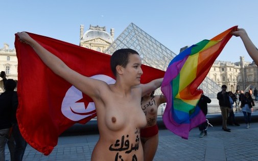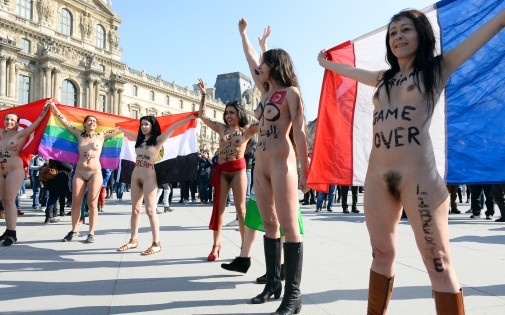 Munies de drapeaux tunisien, iranien, arc-en-ciel et français, elles se sont dévêtues devant l'entrée du musée, avant de marcher sur les rebords des bassins qui jouxtent la pyramide. Elles ont scandé "liberté, laïcité, égalité", sous le regard étonné des badauds et touristes, dont certains immortalisaient la scène avec leur téléphone portable.