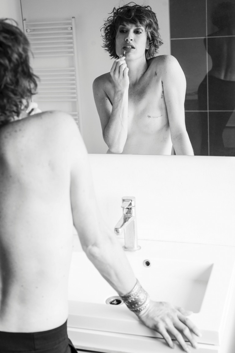 Léna, ma modèle, est à l’initiative de ce projet. Un maquillage pour habiller ce qu’elle appelle son « non-sein » et dire la force que lui donne sa famille dans son combat contre la maladie. Sylvaine, tatoueuse, impliquée et complice, réalise le maquillage. Une très belle rencontre, de celles qui unissent les hommes et les femmes autour de grandes causes. Léna livre ces mots : "Laurent, Axel, Adrien, Vincent, Capucine, Candice, Johanna et Lena (LAVICAJOLE) est le symbole de ma famille et de notre force."