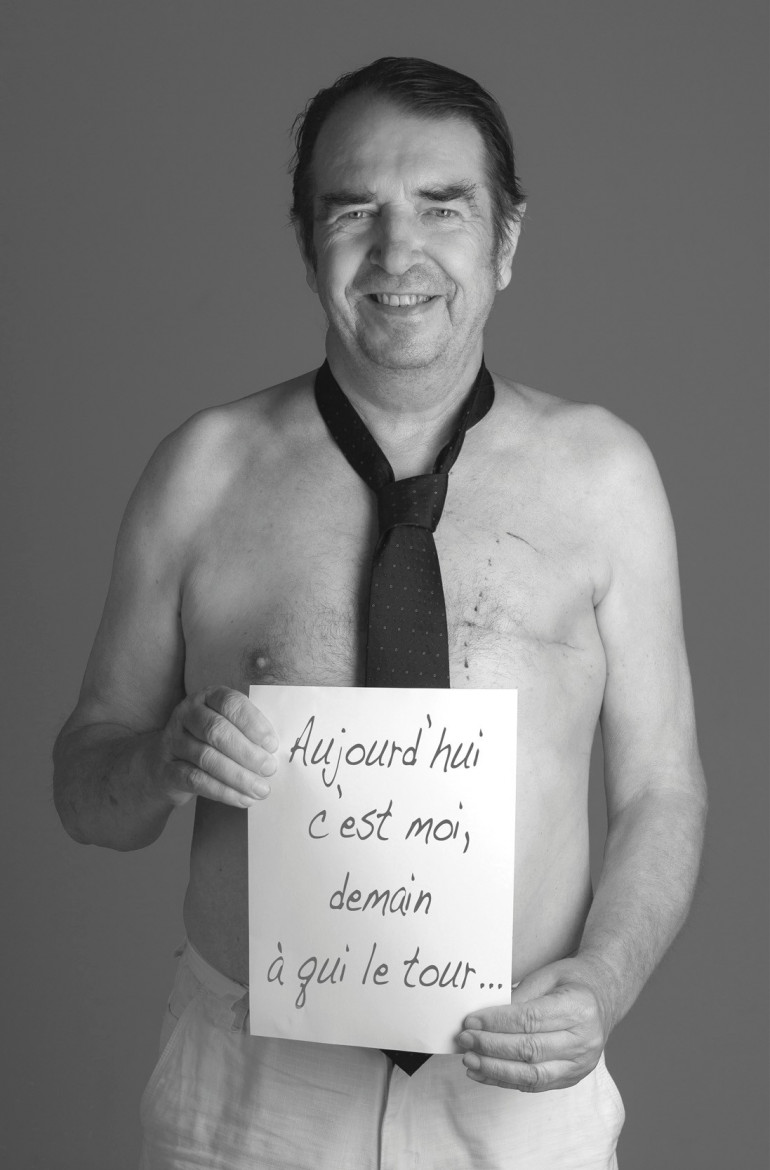 Et oui... pourquoi pas un homme ? Je fais partie de l’association Espoir & Vie de ma ville et je cherchais depuis longtemps un homme à photographier, mais pas n’importe quel homme ! Je l’ai trouvé et il a tout de suite répondu positivement car chacun peut être confronté à cette maladie. Oui, les hommes ont des seins ; le cancer du sein peut aussi les concerner. C’est un monsieur très ouvert, un bon vivant. Nous avons voulu reprendre le slogan TV d’un célèbre jeu de hasard : "Aujourd’hui c’est moi, demain à qui le tour ?" Il ne s’agit pas d’une moquerie, mais d’un message simple pour sensibiliser chacune et chacun au dépistage du cancer. Un grand merci à toutes celles et tous ceux qui osent se dévoiler pour faire avancer la lutte contre cette maladie.