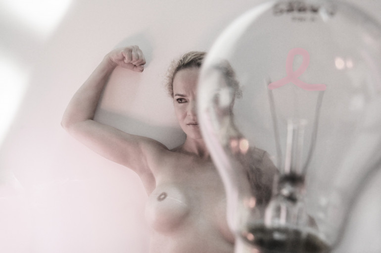 La protagoniste de cette photographie est la femme et non la maladie. Cliché pris dans le noir, le sujet éclairé d’un spot pour accentuer les contrastes, comme pour marquer le bout du tunnel. Mon amie voulait retrouver sa féminité, une féminité quelle pensait avoir perdue. Cette image est le moyen de lui apporter une autre vision d’elle-même. Sérénité. Force. Assurance. Beauté. Cette "Pink Energy", représente l’espoir recherché à travers de nouveaux regards, à travers mon regard. Cette séance photo a été pour moi une vraie leçon de vie. Pour elle, une thérapie. Pour nous, une fierté.