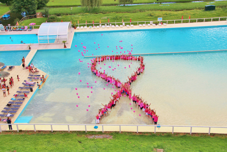 L’énergie de 100 femmes d’un camping de Normandie réunies dans l’eau, le temps d’une photographie. Notre camping est une vraie communauté. Certaines de nos résidentes sont atteintes du cancer du sein et nous nous sentons tous particulièrement touchés par cette cause. C’est donc tout naturellement que nous avons décidé de mobiliser nos campeuses. Chaque participante a promis de se faire dépister et tient dans sa main un ballon auquel est attaché un message : "Si vous trouvez ce ballon, faite-vous dépister contre le cancer du sein". Les ballons ont ensuite fait leur chemin. Qui sait, un simple ballon pourra peut-être sauver une vie ? L’union fait la force !