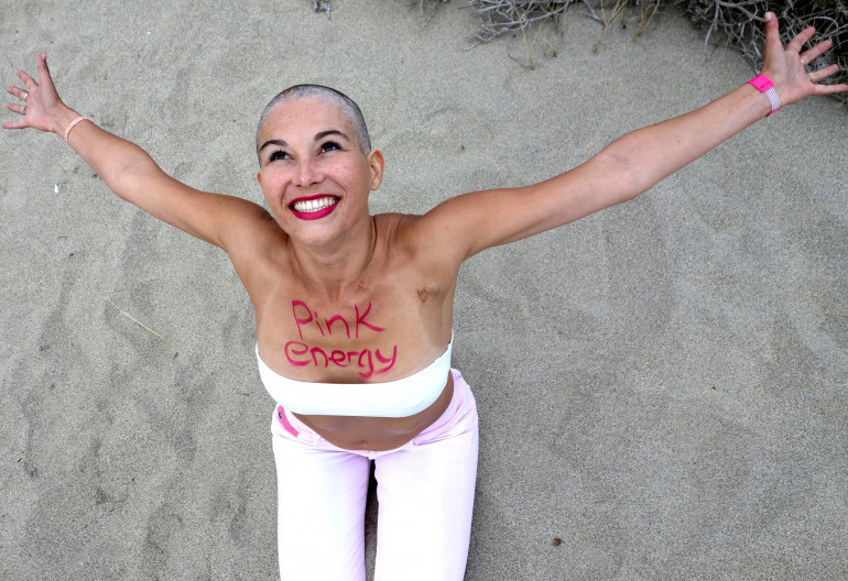 L’instinct de vie est une ressource d’une force insoupçonnée, qu’une seule chose peut arrêter : ne pas avoir le temps de s’en rendre compte. 2008. 30 ans. Au-delà des mots « séquelles irréversibles », cette vague rose et le soutien de ses proches ont été autant de vents dans ses voiles pour les dépasser, une à une. Cinq ans et demi après, elle vient enfin d’entendre les mots "rémission complète" et d’obtenir son diplôme d’éducatrice sportive. Ce vent puissant souffle encore, de plus en plus intensément. Les "séquelles" reculent mystérieusement, d’année en année, grâce à ce mouvement continu. Le mouvement, c’est la vie, l’incarnation à la fois forte et douce de son corps, l’expression à la fois silencieuse et rugissante de son âme d’amazone. Le dépistage précoce lui aurait épargné bien des choses. Il est la meilleure arme pour nous toutes. Personne n’avait jamais vu ces cicatrices, ce sein reconstruit, qui racontent son histoire, celle d’un cancer que les médecins ont guéri, mais aussi du sens de sa nouvelle ligne de vie. Elle a choisi d’oser. L’énergie rose est là, elle résonne et illumine chacun de ses gestes qu’elle a envie d’offrir au plus grand nombre. Alors, que la lumière soit !