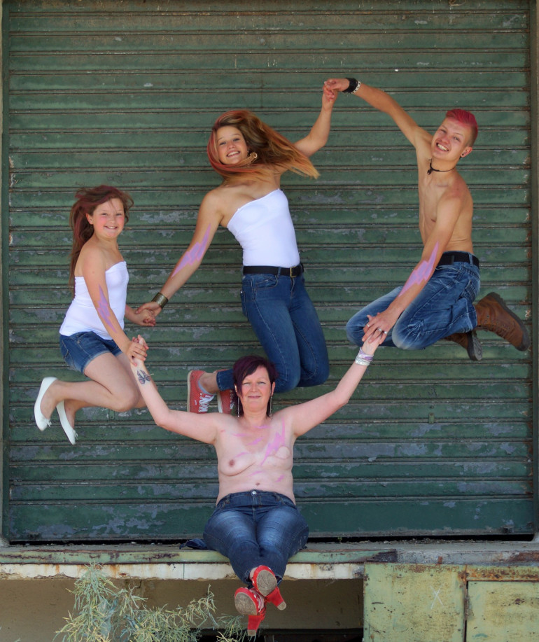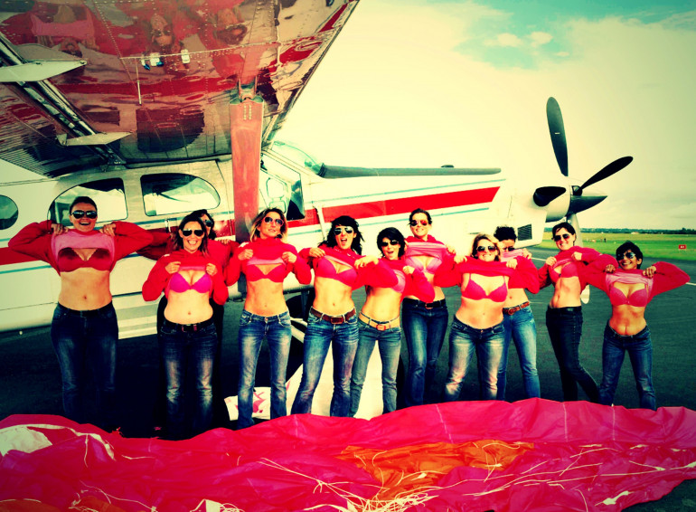 Touchées directement ou indirectement par le cancer du sein, nous, Les Givrées, une bande de copines, on a décidé de se bouger ! Nous n’avons pour seule arme que notre énergie pour sensibiliser au dépistage, soutenir la recherche et rendre hommage aux femmes qui mènent le combat contre la maladie. Saluer le courage et l’énergie de ces femmes, nos mères, nos sœurs, nos amies : voilà notre objectif ! Alors depuis trois ans, nous portons les couleurs de la lutte contre le cancer du sein à travers nos défis ! On déplace des montagnes, on court pour la bonne cause, on pédale pour l’espoir et on tire la langue au cancer en montrant nos soutiens-gorge roses ! Cette photo, c’est une chute libre à 200 km/h, un grand saut dans l’inconnu, plein de symbolique, de vie et d’énergie.