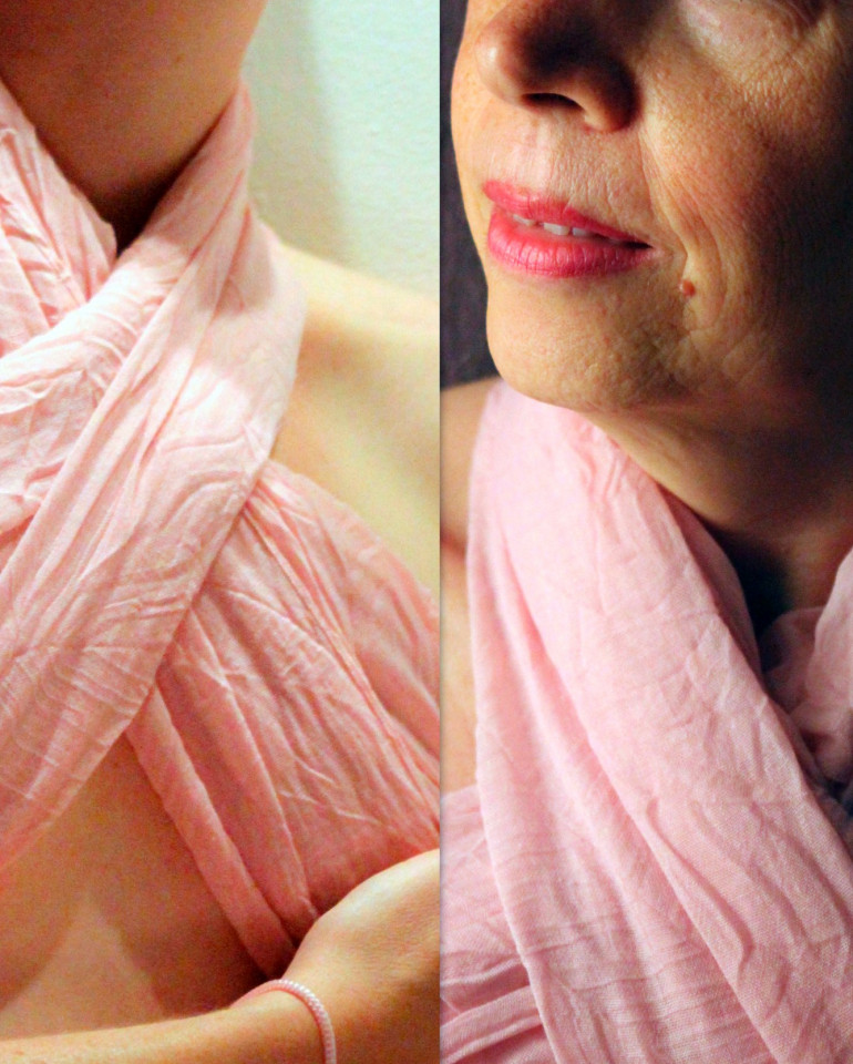 À travers le voile rose porté par mes modèles, je ressens tout à la fois la fragilité, l’optimisme et le dynamisme. Sous le voile, on ne remarque pas l’absence d’un sein. Deux photographies en une, porteuses chacune de la part d’une histoire singulière, mais unies pour un même message de prévention du cancer du sein.