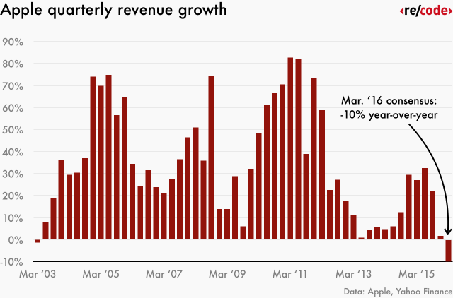 Les analystes tablent même sur une baisse à deux chiffres. Selon leurs estimations, Apple devrait annoncer dans la nuit de lundi à mardi un chiffre d'affaires de 52 milliards de dollars au deuxième trimestre 2016, soit une baisse d'environ 10% par rapport à la même période en 2015. Comme le montre le graphique du site américain Re/Code, il faut remonter treize ans en arrière pour trouver la trace d'un trimestre en baisse d'une année sur l'autre.
