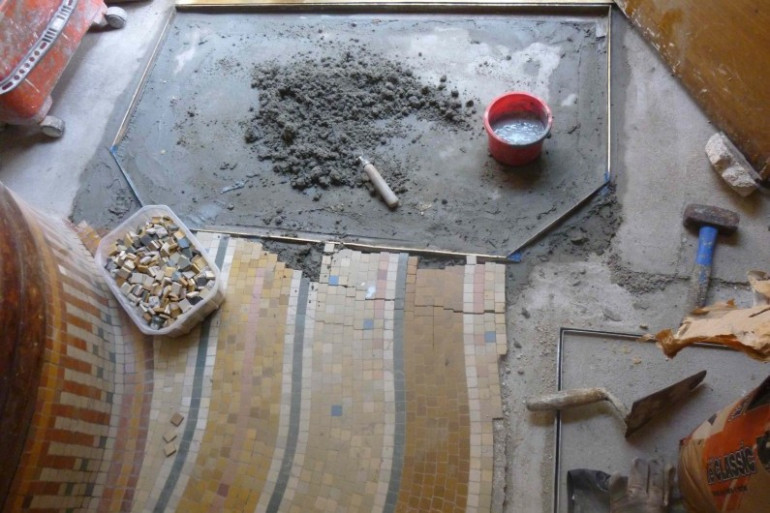 "Je fais beaucoup de restauration, cela occupe une grande partie de mon travail. Mais je suis quand même amené à faire de la création pour des particuliers : de la salle des bains, des sols, des murs ou des psicines", indique Arnaud Pereira. Travailler les mosaïques, c'est toute une technique, comme un jeu de miroir. Il travaille ses mosaïques à l'envers à l'atelier. Il va ensuite sur les chantiers pour les poser. Une technique qui a tout de même grandement évolué.