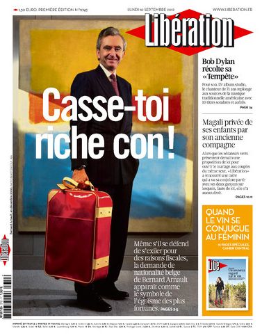 "Casse-toi, riche con !" : les mots à la une de Libération du 30 septembre 2012 sur une grande photo de Bernard Arnault avaient fait polémique. Le quotidien ironisait alors sur les soupçons d'exil fiscal du patron de LVMH, après sa demande de nationalité belge. "Quand il a vu cette une, il a éclaté de rire" raconte aujourd'hui son épouse, Hélène Mercier-Arnault, invitée de Marc-Olivier Fogiel sur RTL.