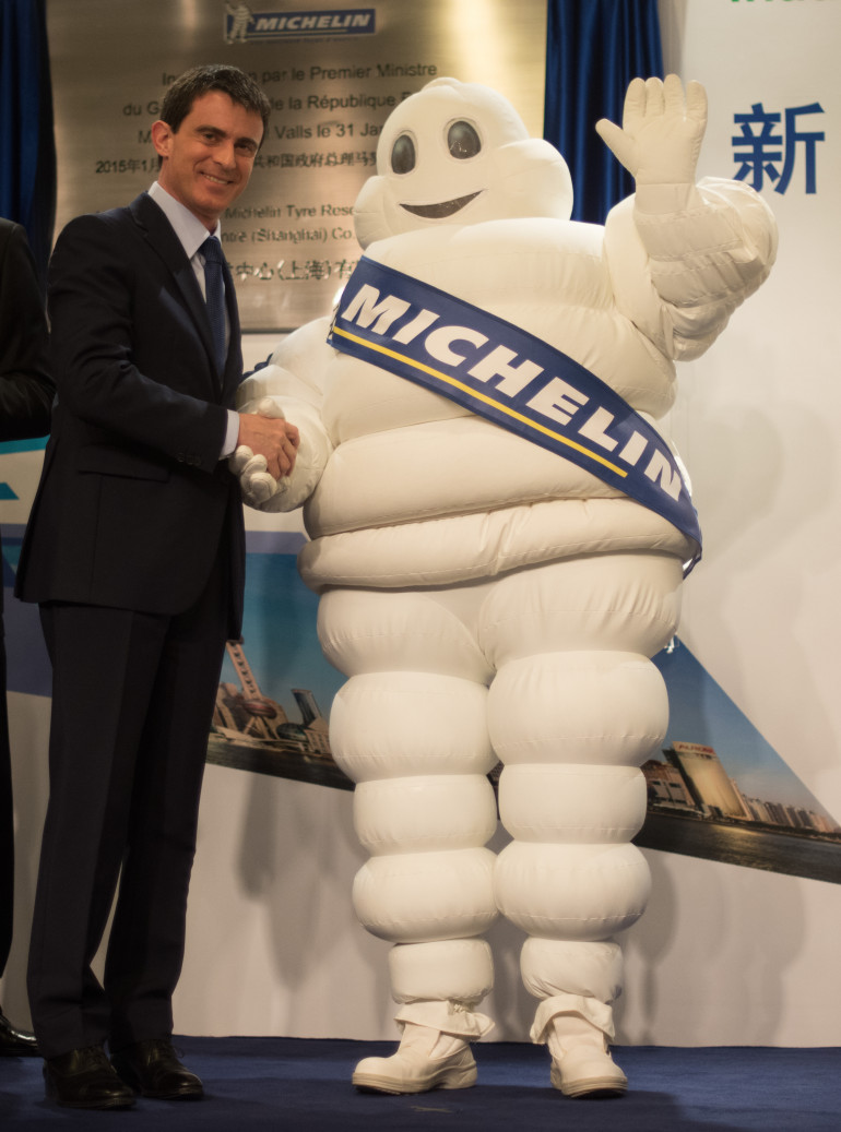 Arrivé vers 09H00 (01H00 GMT) depuis Pékin, le Premier ministre a commencé sa journée dans la capitale économique chinoise par l'inauguration officielle d'un centre de recherche et développement du géant francais des pneumatiques Michelin. Il a eu droit à la photo souvenir avec un employé costumé en Bibendum, provoquant les rires de la salle.
