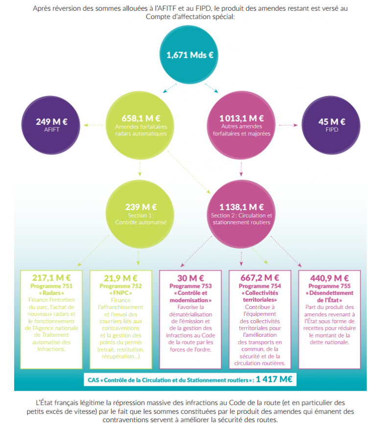 "Où va l'argent des infractions routières ?", s'est demandé l'association. Si l'État assure que cet argent est investi dans l'amélioration de l'état des routes, ce n'est pas si évident selon l'association. En effet, seul un tiers de la recette, soit 667,2 millions d'euros, a pour but d'améliorer les transports en commun, la sécurité et la circulation routière. Si l'on en croit les estimations de l'association, un quart de la recette soit 440,9 millions d'euros, est réinvesti dans un programme de désendettement de l'État. Plusieurs centaines de millions sont aussi utilisés pour entretenir le système de contrôle sur les routes.