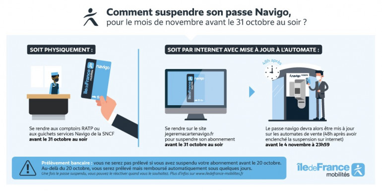 Vous pouvez donc suspendre votre navigo annuel sur internet, via le site d'Île-de-France mobilités, où il faudra appliquer la procédure avant le 31 octobre au soir. Il faudra en revanche vous rendre jusqu’à un automate de vente en gare ou en station, en respectant un délai de 48h après avoir enclenché la suspension sur internet.