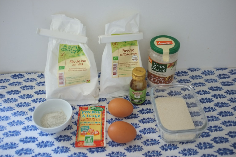 Avec les journées chaudes qui s'annoncent et l'envie de glace, il est très facile de cuisiner les traditionnels biscuits "à la cuillère" croustillants. Les farines sans gluten utilisées ici sont assez basiques : farine de riz demi-complet et fécule de maïs.