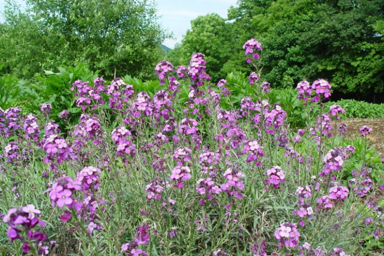 Tous les jardiniers français connaissent la petite giroflée jaune vif, qui pousse au printemps dans les murailles. Mais celle-ci est différente. C’est la giroflée anglaise. Plus grande, presque un arbuste, tout rond et qui vous arrive au genou. Son vrai nom complet, c’est Erysimum Bowles Mauve. Son feuillage reste en hiver, il est gris bleuté et ses fleurs sont mauves doux.
