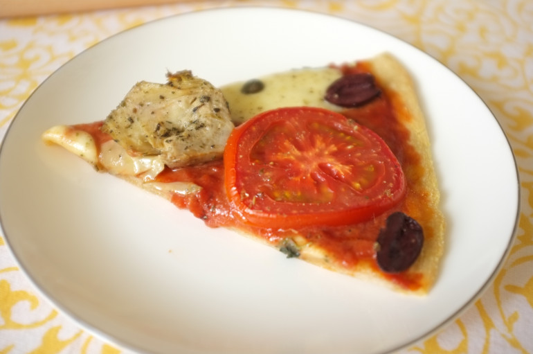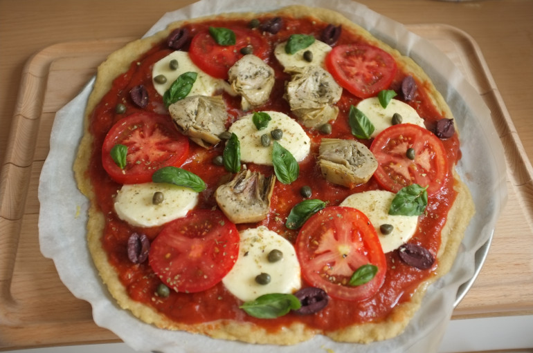 Badigeonner la pâte à l’huile d’olive, à l’aide d’un pinceau en silicone. Enfourner la plaque dans le four sur la grille de milieu. Cuire 7 à 10 mn. Sortir du four et mettre la sauce : ici une sauce tomate, cœurs d’artichauts, câpres, rondelles de tomates, mozzarella, origan et olives noires. Re-badigeonner les bords de la pizza à l’huile d’olive. Remettre à cuire 7 à 10 mn.