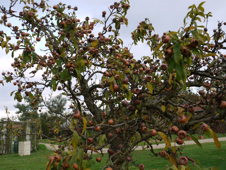 Sa silhouette est légère et ses fleurs blanches ont la grâce de celles des pommiers. Avantage appréciable, elles s’ouvrent tard en mai, après les gelées. Ce qui fait que l’on a des fruits tous les ans. Les fruits des néfliers greffés sont plus gros qu’une balle de ping-pong, presque ronds, avec un petit plumet à l’extrémité. Orangés en été, bruns à maturité.