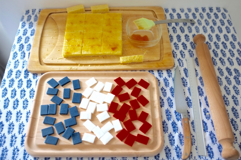 Étaler la pâte à sucre : déposer chaque couleur de pâte à sucre sur une plaque lisse (Si vous n’avez qu’une seule plaque, commencer par la couleur blanche, puis rouge, puis bleu qui est la plus foncée). Déposer dessus une feuille de film alimentaire et étaler au rouleau à pâtisserie afin d’obtenir des rectangles pour chaque couleur. Dans ces rectangles, découper dedans, toujours à l’aide d’une règle et d’un couteau, des mini rectangles de 3cmx 2cm, pour obtenir un total de 18 mini rectangles pour chacune des couleurs (un total tricolore de 54 mini rectangles de pâte à sucre). Garder de côté.