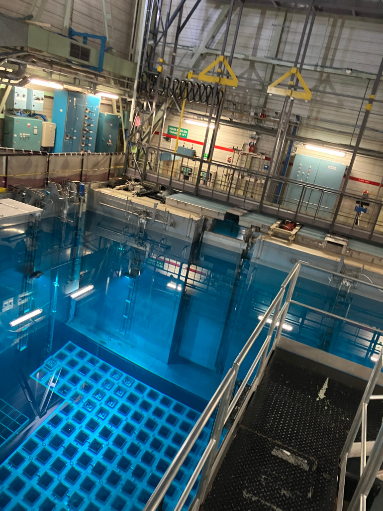 Pour vérifier que tout le combustible a bien été évacué, il faut monter un grand escalier métallique en colimaçon pour arriver dans l'un des endroits les plus sensibles et les plus sécurisés de la centrale. Nous sommes au-dessus d'une immense piscine bleutée, d'une profondeur de 20 mètres, et tout au fond, on remarque des alvéoles métalliques vides.