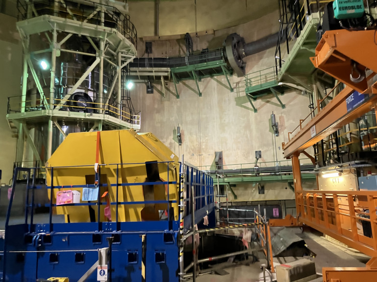 Une grue télescopique a été installée dans le bâtiment réacteur, pour faciliter les travaux. Tout est prêt pour passer à la découpe et à l'évacuation de ces générateurs de vapeur qui étaient essentiels pour la production d'électricité.