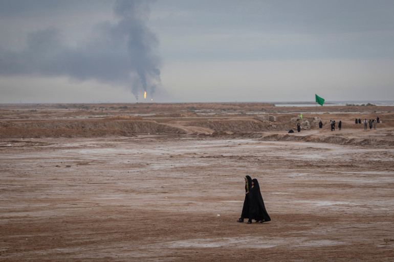 Deux femmes iraniennes traversent la zone où se trouve des puits de pétrole au sud de Téhéran, en Iran