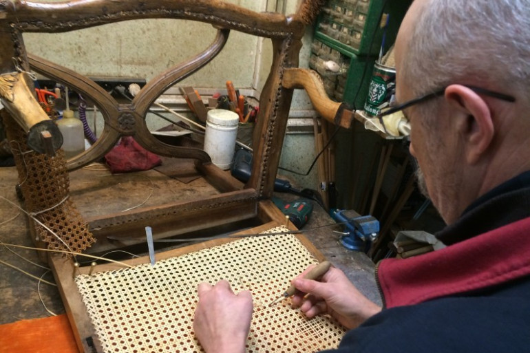 Frédéric Gallin, canneur-rempailleur, en pleine action dans son atelier parisien