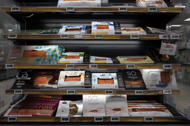 Un rayon de supermarché proposant du saumon à la vente, à Sceaux en décembre 2022.