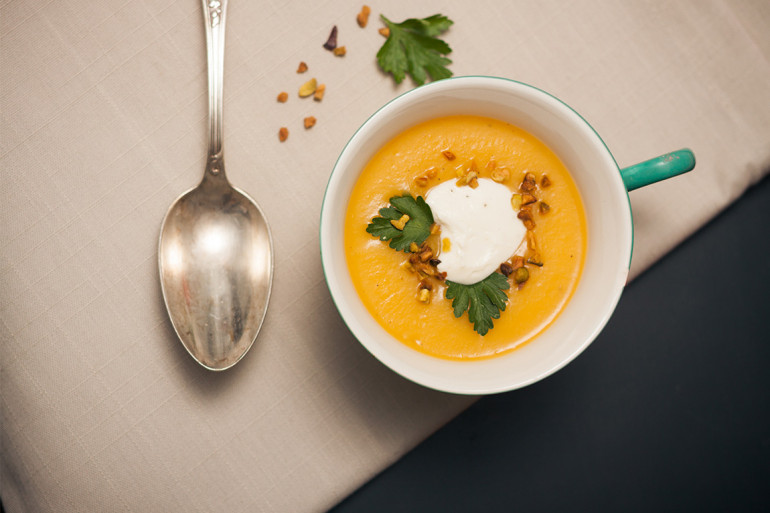 Servir en assiette creuse, ajoutez un peu de crème émulsionnée sur le dessus du velouté pour faire comme un cappuccino.