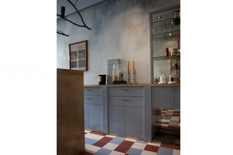 Mobilier classique dans des teintes fortes et des couleurs extrêmes, sol "cementine" bleu poudre, bordeaux et ivoires. Les deux architectes ont su transmettre l’histoire, l’identité de la Maison Trudon au travers de codes plus contemporains.