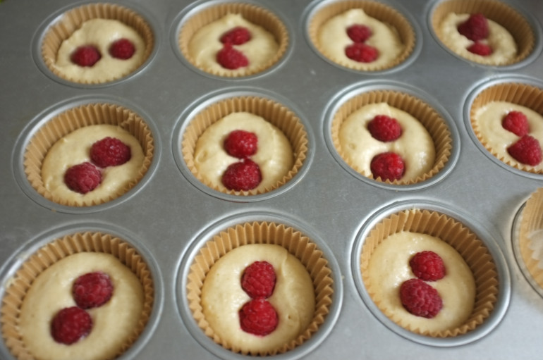 Déposer dans chaque petit moule rempli de pâte sans gluten deux framboises.