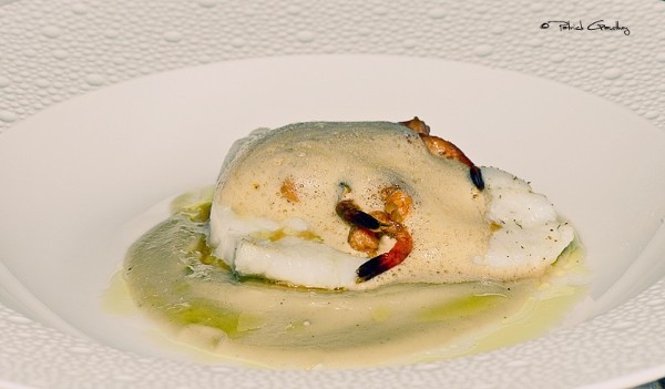 Barbue cuite au Convo, mousseline d'artichaut au miel, émulsion de crevettes grises à la citronnelle.