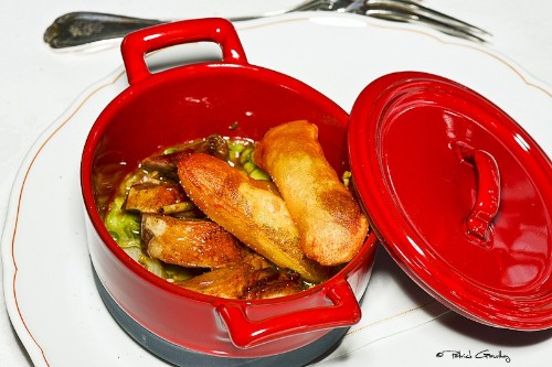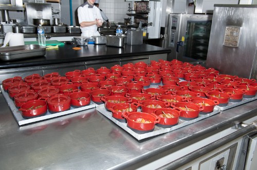 En attente d'être envoyée, la cocotte Revol de pigeon à la langue de boeuf, la cuisse confite, petits pois à la française et pomme soufflée.
