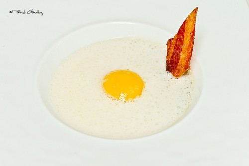 La mise en palais proposée par Jean Denis Rieubland: Jaune d'oeuf confit en basse température, royale d'asperges, bacon.
