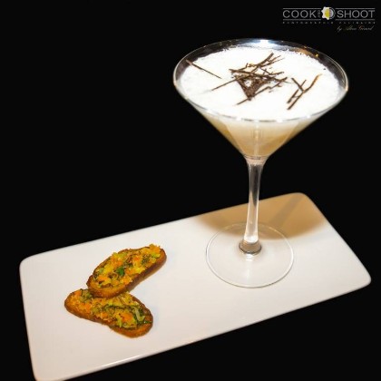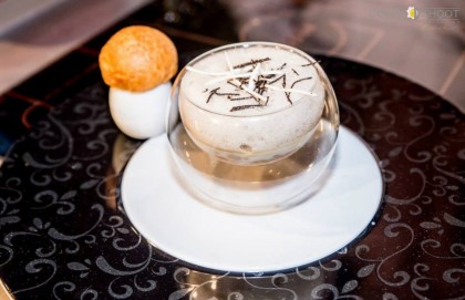 Œufs de caille cuits cocotte et potiron juste croquant, crémeux champignon, émulsion de truffe par Eric Finon.