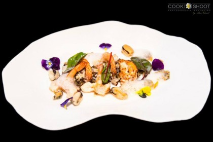 "Céréales des Incas", petites gambas en papillon, écume de coquillage, pétales de pensées, par Hermance Carro.