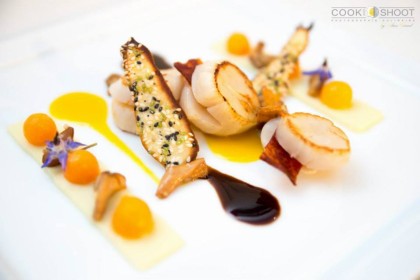 St Jacques rôties, chorizo, jus de mandarine et panais, girolles.