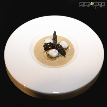 Velouté de lentilles à la truffe, Noix de Saint Jacques en viennoise de noisettes au lait d'amandes par Philippe Joannès (Fairmont Monte Carlo et MOF 2000)