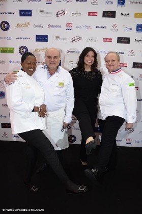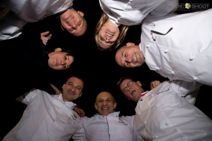 Joël Robuchon entouré de ses pairs; Babeth de Rozières (La Case de Babeth, Maule), Jean Denis Rieubland (Le Negresco, Nice), Michel Roth (Le Ritz, Paris et Président Wilson, Genève), Guillaume Gomez (Palais de L'Elysées), Philippe Joannès (Fairmont Monte Carlo), François Adamski (Le Gabriel, Bordeaux), Fabrice Prochasson (Lenôtre), Simon Ganache (Fairmont Monte Carlo), Gérard Baud (Téléshopping - TF1)...