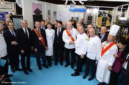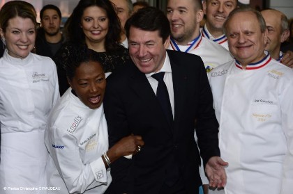 Christian Estrosi entouré de Babeth de Rozières, présidente du Concours La Main d'Or au Féminin, Joël Robuchon, président d'honneur de la 26ème édition du Salon, Guillaume Gomez, chefs des cuisines du Palais de l'Elysées et Carinne Teyssandier, animatrice et écrivain culinaire.