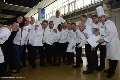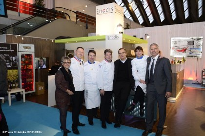François Adamski (Bocuse d'Or 2001 et MOF 2007, Le Gabriel à Bordeaux) et Michel Roth (Bocuse d'Or 1991 et MOF 1991, Le Ritz Paris et Hôtel Président Wilson à Genève) avec l'équipe d'Enodis emmenée par Laurent Lecourt-Capdeville et Eugénie Guillemin.
