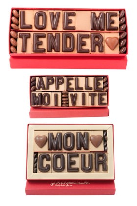 Tendance Elvis ou Anaïs, Jadis et Gourmande vous propose d'écrire vos mots d'amour en lettres chocolatées, bonbons de chocolats et dragées (Jadis et Gourmande, 56 Rue Saint-Placide, 75006 Paris).