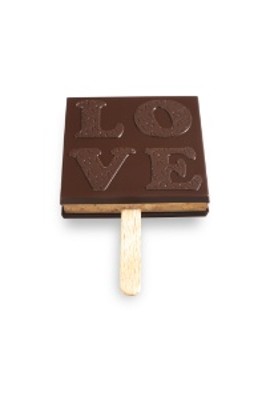 Pop Love est un esquimau formé de deux tablettes carrées LOVE au chocolat au lait et chocolat noir, renfermant un praliné au riz soufflé, au speculoos et au sucre pétillant et une ganache au chocolat noir.