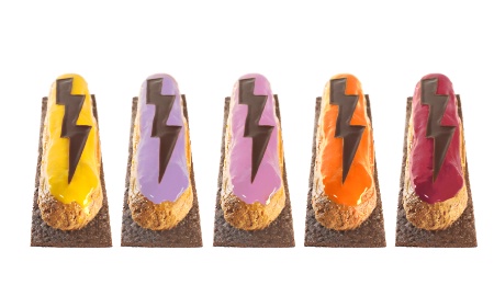 Conçu pour être partagé à deux, l'éclair Coup de foudre est décliné en 5 couleurs : jaune pour la mangue, rouge pour framboise-cerise, orange pour orange-mandarine, violet pour cassis-violette et rose pour rose-framboise.