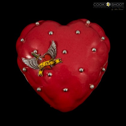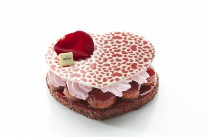 Laurent Favre Mot propose un coeur "T'as Tout Moi" rouge passion composé d'un biscuit dacquoise au biscuit de Reims rose Fossier, de fraises des bois et d'un crémeux champagne rosé, recouvert d'un glaçage rouge chocolat blanc (Laurent Favre-Mot, 9 rue Breteuil, 13001 Marseille).
