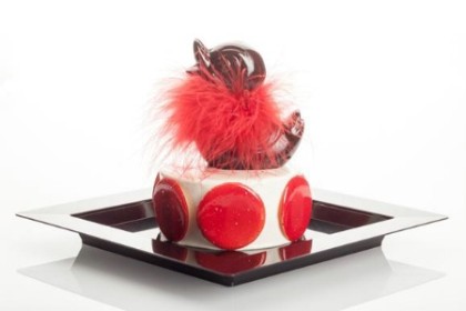 Sweet fire est fait de mousse mascarpone, d'une compotée de fruits de cranberry et baies de goji et d'une touche de piment espagnol Niora, surmonté d'un coeur macaron à la rose (Christophe Roussel, 19 Avenue de Gaulle, 44500 La Baule).