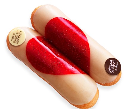 Christophe Adam propose un Duo de Cœur chez L’Eclair de Génie: un éclair à la vanille de Madagascar et à la rose de Damas jouxtant un éclair au Chocolat Gianduja.
